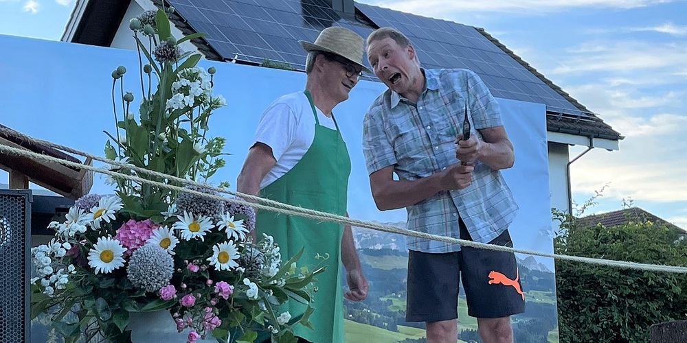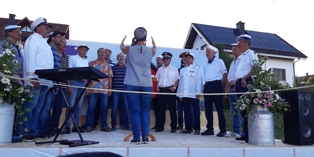 In einem weiteren Block wanderten die Sänger, mit Edelweisshemd bekleidet und entsprechendem Outfit, Richtung Toggenburg und Alpstein. Ihre Erlebnisse erzählten sie dabei gesanglich mit den Liedern „Siloballe-Blues“, „Morgenrot im Alpstein“ und Alperose.