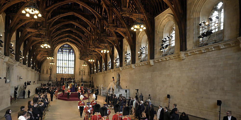 Queen Elizabeth II. war am 8. September im Alter von 96 Jahren auf ihrem schottischen Landsitz Schloss Balmoral gestorben. Ihr Sarg sollte noch bis zum frühen Montagmorgen in der Westminster Hall - dem ältesten Teil des britischen Parlaments - aufgebahrt bleiben.