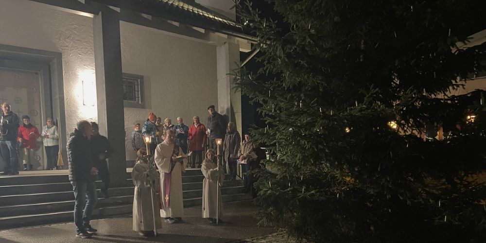 Bei Gesang der Teilnehmenden und adventlichen Klängen der Bläser der Musikantengruppe sowie mit erhebenden Worten von Diakon Peter Schwager wurde der Christbaum gesegnet und erstmals erleuchtet. Jetzt bringt er während der Weihnachtszeit in aller Stille Licht und Freude auf den Jonschwiler Kirchplatz.