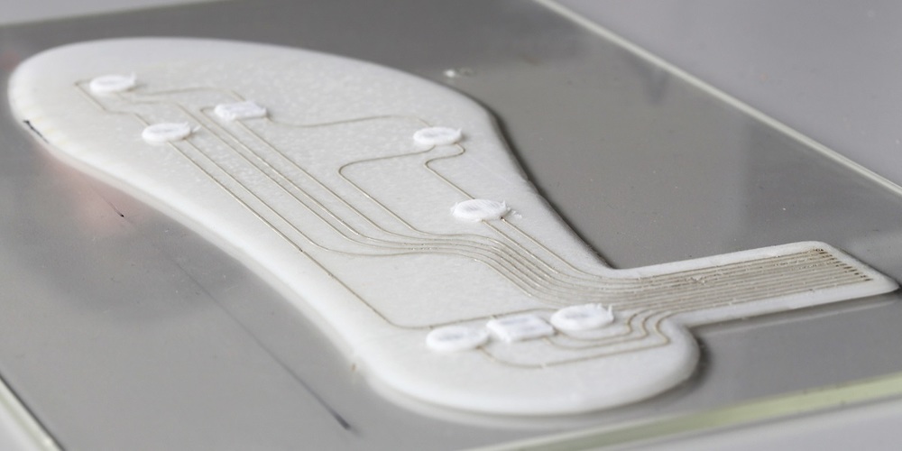 Auf diese erste Schicht drucken sie dann mit einer leitfähigen silberhaltigen Tinte die Leiterbahnen, und auf diese an einzelnen Stellen – mit russhaltiger Tinte – die Sensoren. Die Verteilung der Sensoren ist dabei nicht zufällig: Sie werden genau dort platziert, wo der Fusssohlendruck am stärksten ist. Um die Leiterbahnen und die Sensoren zu schützen, überziehen die Forschenden diese mit einer weiteren Silikonschicht.