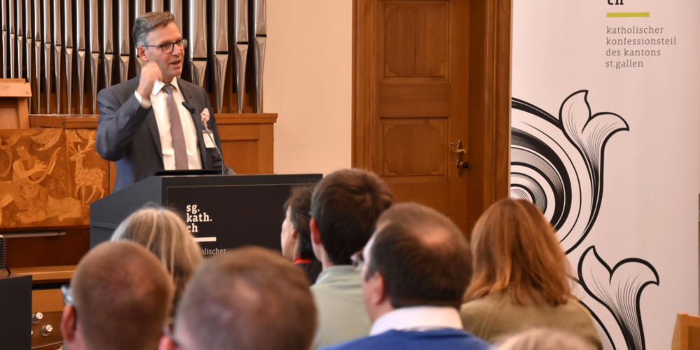 Mehr in die Strukturen der Kirche eintauchen liess das Referat von Thomas Franck, Verwaltungsdirektor des Katholischen Konfessionsteils. Dabei stellte er unter anderem klar, dass der Konfessionsteil eine Art Nachlassverwalter der einstigen Fürstabtei St.Gallen ist und auch Gebäude wie die Kathedrale St.Gallen oder die Stiftsbibliothek nicht etwa dem Bischof gehören, sondern dass dies Volksvermögen ist und somit allen Katholiken im Kanton gehört.