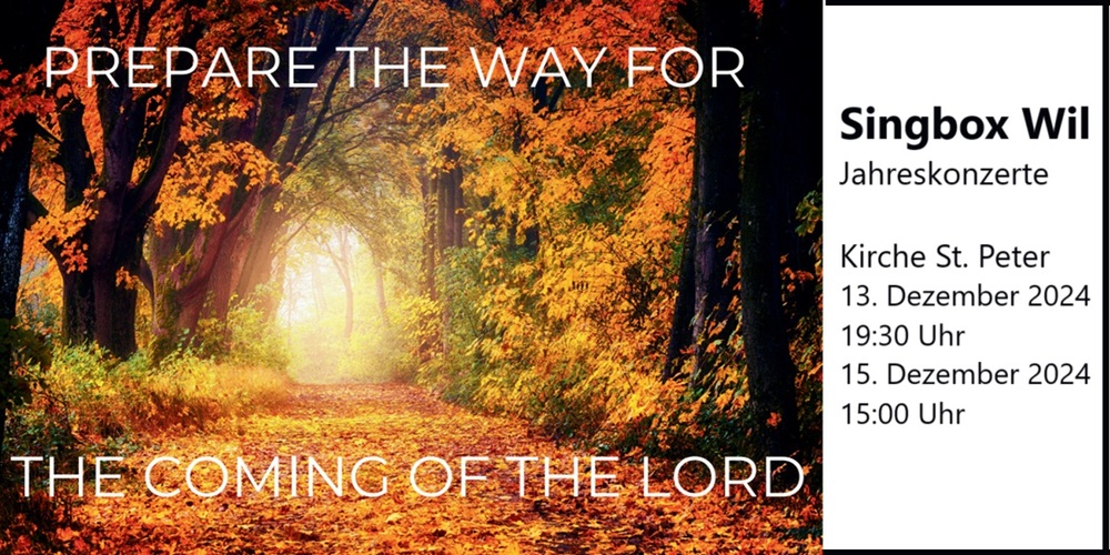 Die Singbox Wil präsentiert ihr Jahreskonzert 2024 unter dem Titel „The Coming of the Lord“. Alle Chöre – von den Singgruppen bis zum jungen Erwachsenenchor intune – bieten ein festliches und stimmungsvolles Programm passend zur Jahreszeit. Geleitet wird das Konzert von Coretta Bürgi, Anja Powischer und Markus Leimgruber. Begleitet werden die Chöre von Verena Stolz-Looser am E-Piano und Thomas Fele am Sopransaxophon.