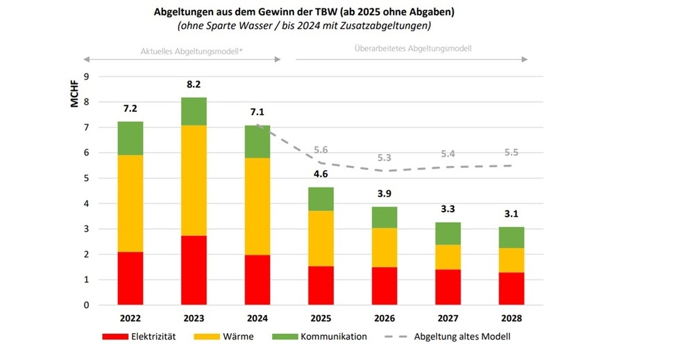 "Die TBW stehen vor einer herausfordernden wirtschaftlichen Ausgangslage und finanziellen Herausforderungen, wodurch das Ergebnis künftig tiefer ausfallen wird. Daneben bestehen im Bereich der heutigen Abgeltung und Abgaben zulasten der Endkunden rechtlicher Handlungsbedarf. Mit der Überarbeitung des Abgeltungsmodells kann der Finanzbedarf und somit die Verschuldung der TBW verringert werden. Jedoch wird die bisherige Höhe der Abgeltung an den allgemeinen Stadthaushalt nicht mehr erreicht. Gleichzeitig werden die nötigen rechtlichen Grundlagen geschaffen."