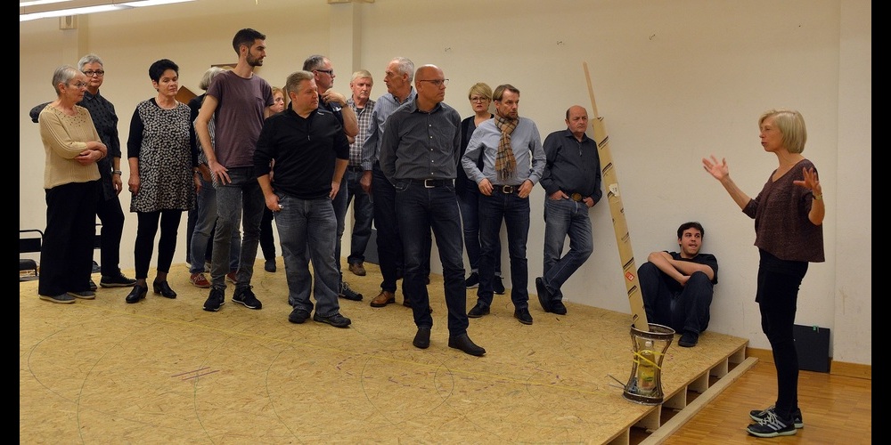 Der Chor steht praktisch durchgehend auf der Bühne. Die Probenarbeit mit den Wilerinnen und Wilern veranlasst Regina Heer zu der Aussage: «Die Schweizer Armee hat ihren Job gut gemacht». Sie hatte den Männern kaum einen Appell erklären müssen, schon seien sie strammgestanden, erzählt sie lachend. «Sie sind total gut im Körper drin». Viel eindrücklicher war aber der Umstand, dass den Männer die Untätigkeit und das Warten vertraut sind: Wie lautet der nächste Befehl? Wann geht es los? «Das ist ja wie im WK», hatte sie mehrmals zu hören bekommen. «Es ist spannend, wenn man in der Regiearbeit Erfahrungswerte einbauen kann», so Heer. Sonst habe man im Alltag ja – zum Glück - nicht unbedingt etwas mit den Opernthemen wie Mord und Totschlag zu tun.