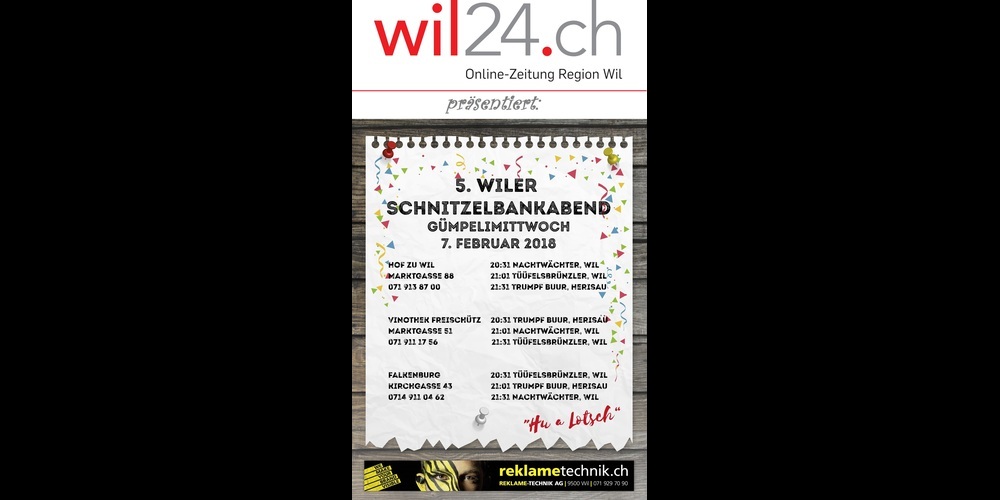 Der 5. Wiler Schnitzelbankabend startet dieses Jahr um 20.31 Uhr! Da die traditionelle Fasnachtseröffnung mit dem neuen "1. Tüüfel-Nachtumzug" etwas länger dauern wird, haben die Organisatoren entschieden, den Start eine halbe Stunde zu verschieben.