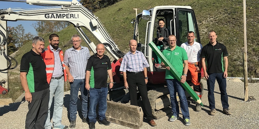 Am Spatenstich für die neue Jubihütte am Mittwoch, 17. Oktober 2018, dabei: v. l. Willi Haag (a. Regierungsrat / SG-Wanderwege), Stefan Nagel (Holcim), Felix Ambühler (Gemeinde Jonschwil), Franz Zweifel (regionaler Wanderweg-Verantwortlicher), Stefan Frei (Gemeindepräsident Jonschwil), Imelda Stadler auf dem Bagger (Kantonsratspräsidentin / Präsidentin SG-Wandewege), Markus Rusch (SG-Kantonalbank, Niederlassungsleiter Wil), Stefan Gämperli (Baggerunternehmen) und Viktor Styger (Geschäftsführer SG-Wanderwege).
