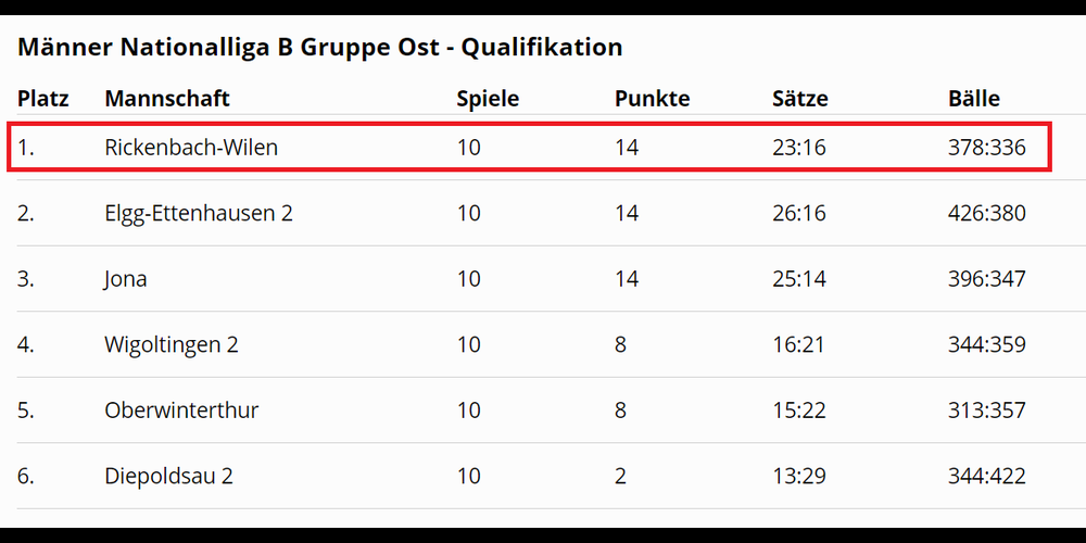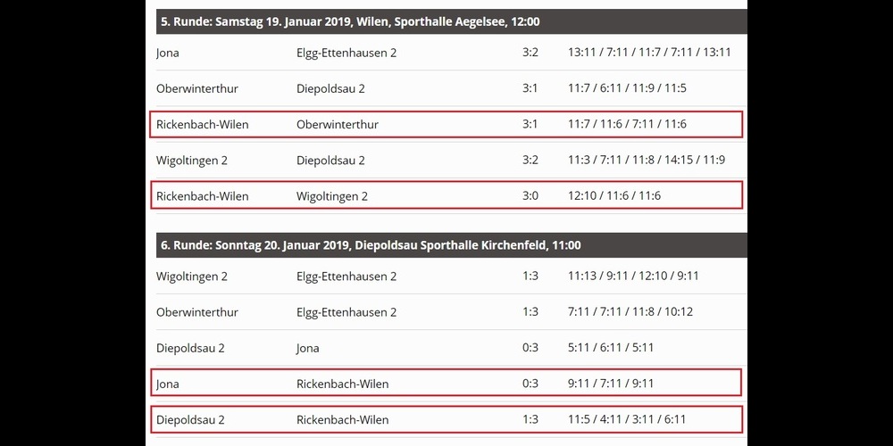 Am kommenden Sonntag, 27. Januar 2019, ab 10:00 Uhr findet in Andelfingen (Halle Niederfeldstrasse 1) die Aufstiegsrunde in die NLA statt. RiWi und Elgg-Ettenhausen 2 aus der Ostgruppe treffen dort auf die beiden Westgruppen Spitzenreiter Olten und Kirchberg (BE). Nach den Partien «Jeder gegen Jeden» steigt der Sieger direkt in die oberste Liga auf. Falls Elgg-Ettenhausen, das in der NLA bereits vertreten ist, gewinnen sollte, rückt der Zweite nach. Dieser müsste allerdings noch ein Barragespiel gegen Neuendorf, dem Letzten der NLA, gewinnen.