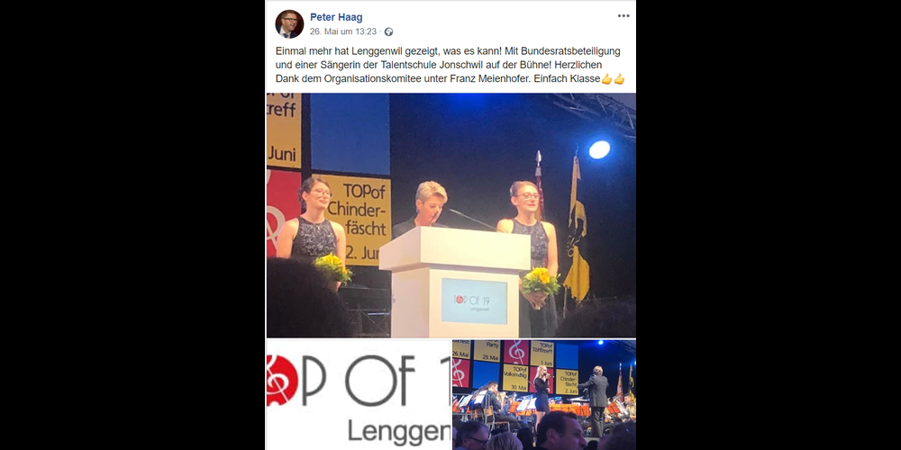 TOPofParty am 29. Mai 2019 Am Mittwoch, 29. Mai 2019, tritt Nickless, Gewinner des Swiss Music Awards, im Festzelt in Lenggenwil auf.TOPofVolksmusig am Auffahrt/Donnerstag, 30. Mai 2019