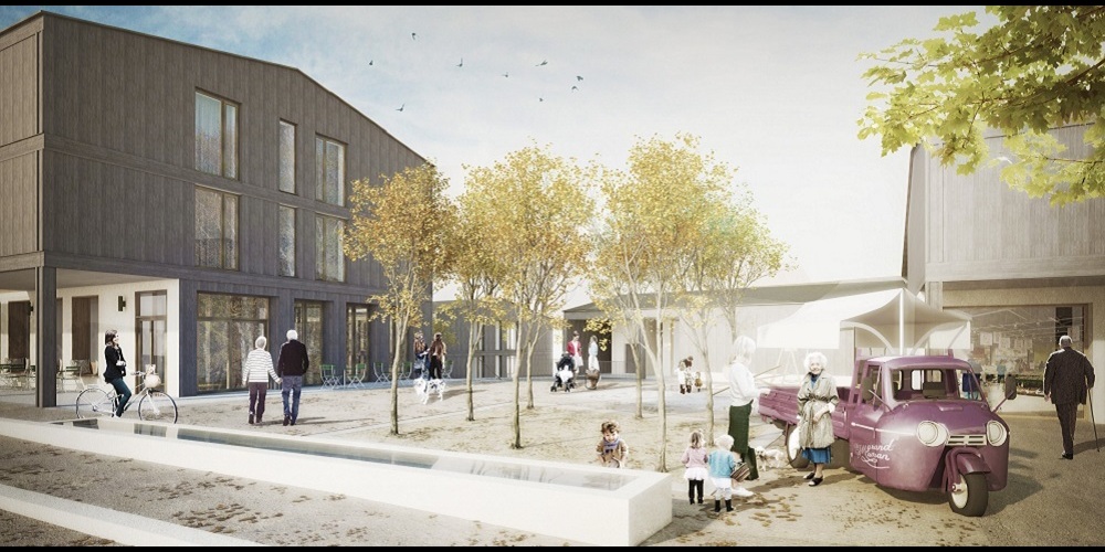 Ein gut proportionierter, neuer Platz entlang der Hauptstrasse bildet die neue Adresse, das Herz der Gesamtanlage. Dort befinden sich das Café «Chez Grand Maman», ein Laden, der Spitex-Stützpunkt sowie die Zugänge für mögliche weitere Dienstleistungen. Die Anlieferung erfolgt über die Bahnhofstrasse direkt ins Untergeschoss.