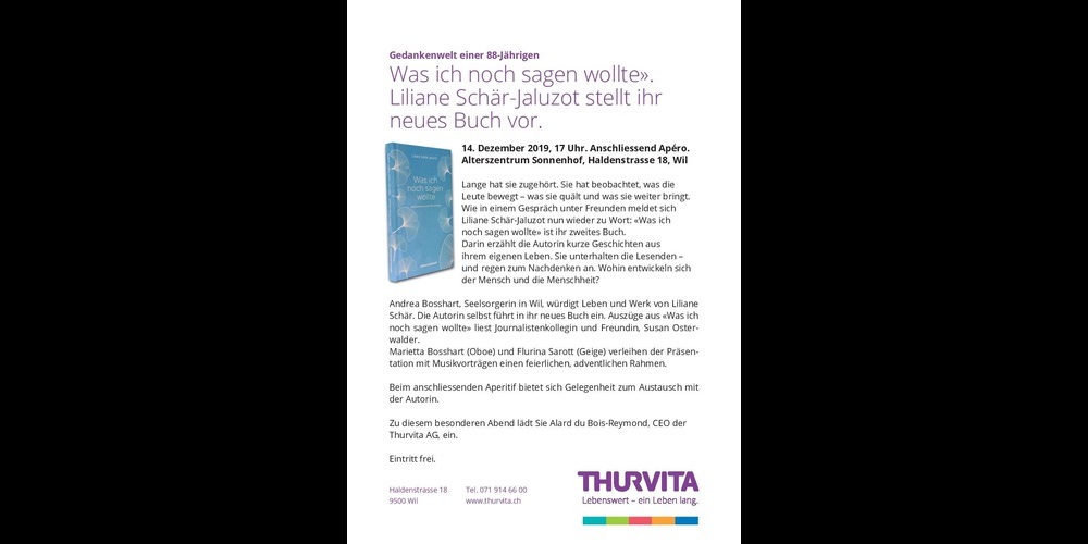 Die Thurvita-Bewohnerin und Journalistin im Ruhestand Liliane Schär-Jaluzot stellt ihr neues Buch vor. Alle Interessierten sind herzlich eingeladen am Samstag, 14. Dezember 2019, 17 Uhr, im Alterszentrum Sonnenhof, Wil. Anschliessend warten Apéro-Köstlichkeiten von «Chez Grand Maman» auf die Teilnehmenden.