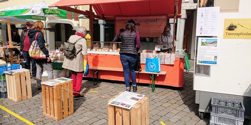 Der grosse Zuspruch widerspiegelte die Beliebtheit des Marktes. Die Stände waren mit Schutzmassnahmen ausgestattet und die 2-Meter-Abstand auf dem Boden markiert. Die grosse Mehrheit der Kundinnen und Kunden verhielt sich rücksichtsvoll und versuchte sich gemäss den neuen Regeln zu verhalten. Das benötigt teilweise noch etwas Übung, aber bereits nächsten Samstag wird das wohl schon bestens klappen.