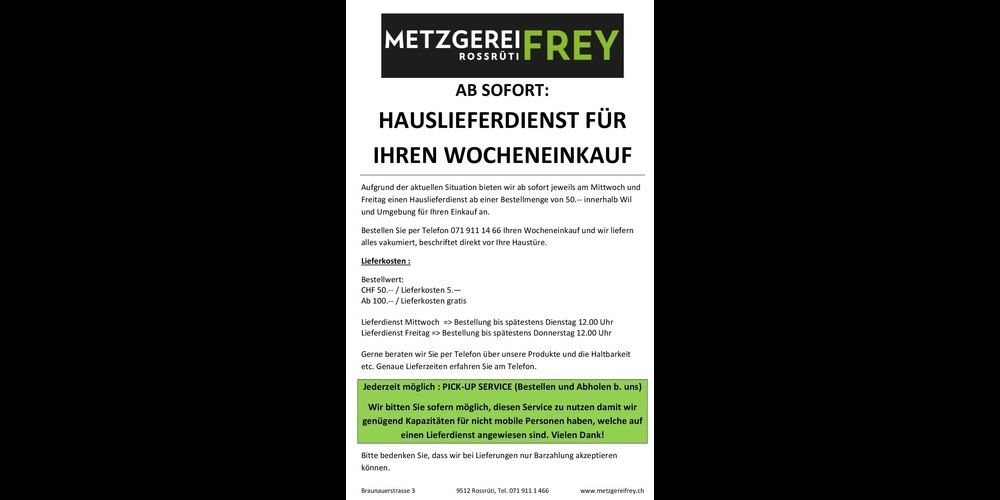 Wer jetzt nicht mehr einkaufen darf oder möchte, ist froh, wenn ihr oder ihm Lebensmittel nach Hause geliefert werden. Bäckereien, Metzgereien und Lebensmittelgeschäfte haben neue Lieferdienste für private Haushalte und für Firmen ins Leben gerufen oder ausgebaut. Hier das Beispiel der Metzgerei Frey aus Rossrüti, die auch mit einem Cargo-Bike ausliefert.