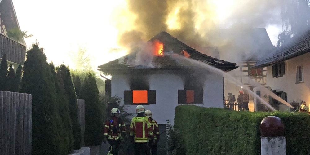 (Kapo TG) Kurz nach 4:30 Uhr meldete eine Nachbarin der Kantonalen Notrufzentrale, dass in einem Haus an der Kirchbergstrasse ein Brand ausgebrochen sei. Beim Eintreffen der Einsatzkräfte befand sich das Haus bereits in Vollbrand. Die Feuerwehr Thundorf und die Stützpunktfeuerwehr Frauenfeld standen mit über 80 Feuerwehrleuten im Einsatz.
