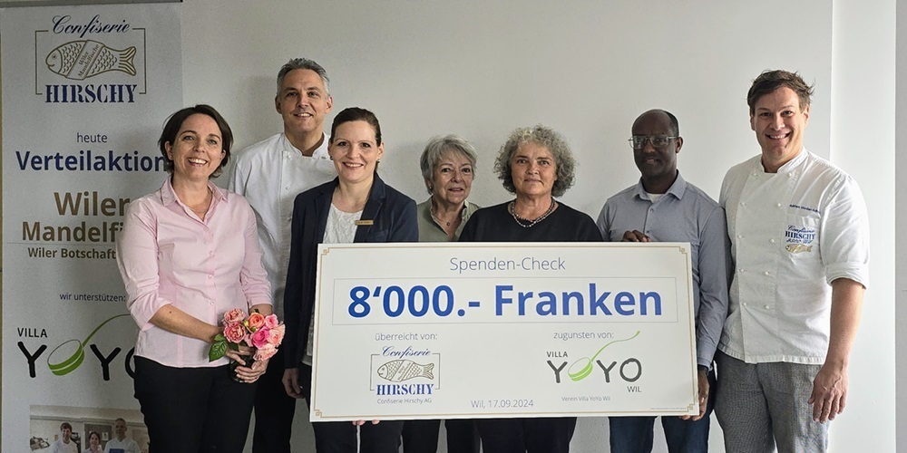 An den beiden Sammeltagen wurden rund 3'000 Franken gespendet. Die Confiserie Hirschy ergänzt die Spenden mit 5'000 Franken, so dass Isabel Schmid und ihr Team den Check im Wert von 8'000 Franken in Empfang nehmen kann. Der Vorstand der Villa YoYo Wil und Isabel Schmid sind begeistert und bedanken sich herzlich bei allen Spendern und bei der Confiserie Hirschy!