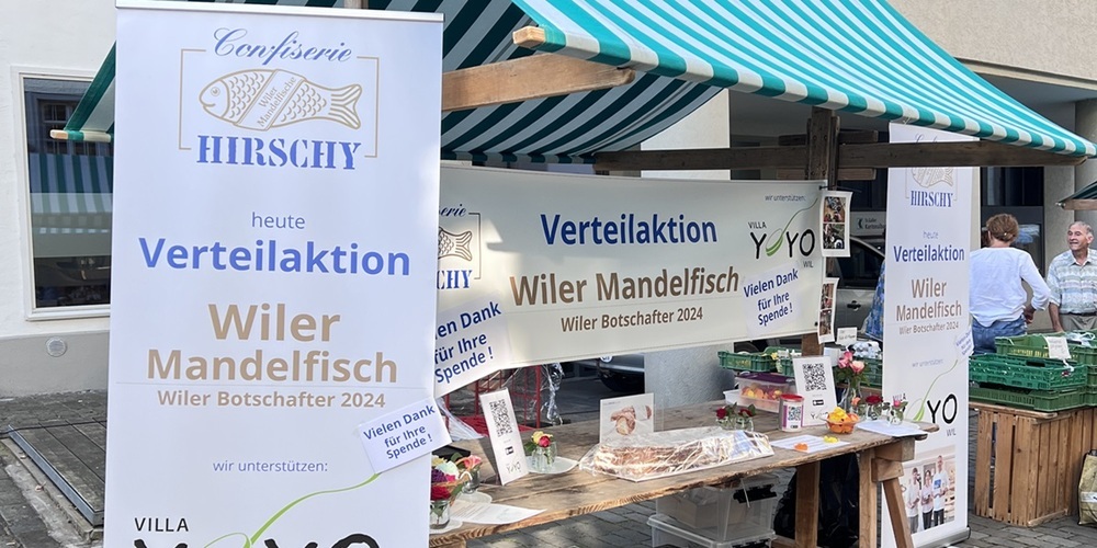 Im Rahmen seines Einsatzes als "Wiler Botschafter 2024" stand der Wiler Mandelfisch im Zentrum einer Verteil- und Spendenaktion. An zwei Samstagen bei wunderschönem Sommerwetter wurde der Botschafter einmal in der Altstadt und zum zweiten Mal an der Oberen Bahnhofstrasse 25 zur kostenlosen Verköstigung angeboten.