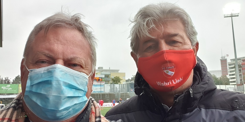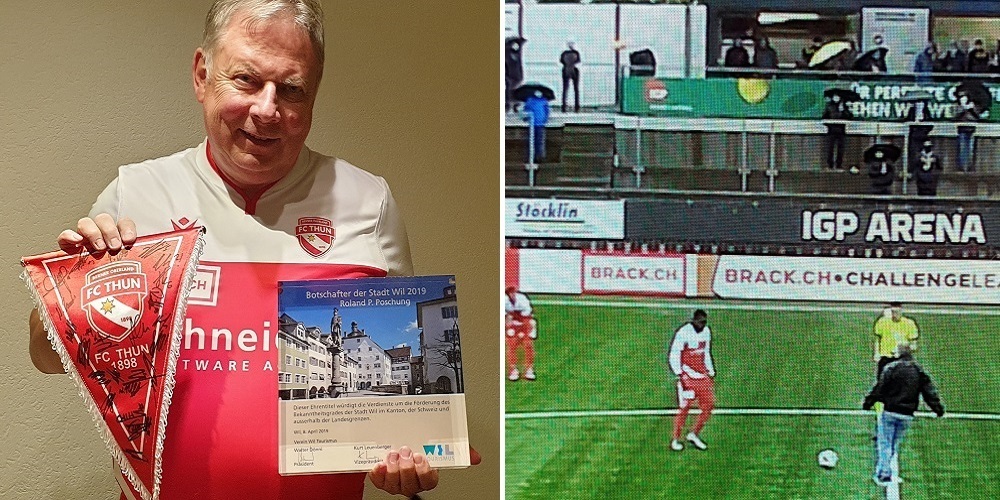 FC Thun-Teammanager Ulrich Fivian überreichte Roland P. Poschung, als Jugendlicher Fan vom FC Thun, zum Spielbeginn als Erinnerung einen Wimpel mit allen Unterschriften der Spieler sowie ein FCT-Leibchen.
