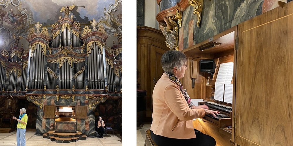 Nach der Führung und vor dem Nachtessen im Festsaal der Klosteranlage gelangten die Teilnehmenden in den Genuss eines halbstündigen Orgelkonzertes durch die Wiler Organistin Marie Louise Eberhard. Die beeindruckende 260 Jahre alte Aichgasser-Orgel mit 2‘265 Orgelpfeifen ist das Herzstück der Barockkirche.