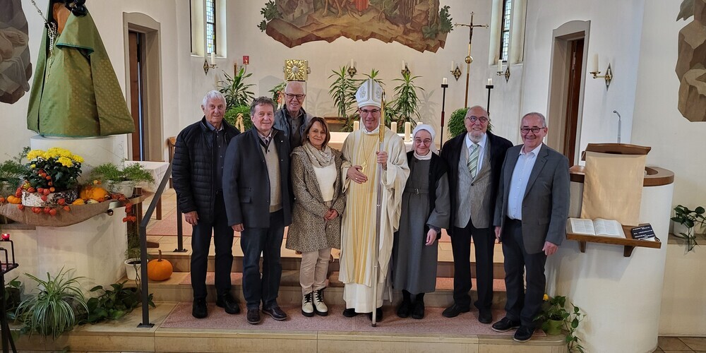 Gruppenbild mit Stiftungsrat, Bischof und Eremitin v.l.: Guido Staub, Noldi Hasler, Josef Schönenberger, Brigitte Breitenmoser, Bischof Beat Grögli, Schwester Maria-Amadea, Edi Schnellmann und Georges Wohlgensinger Bild: Bistum St. Gallen