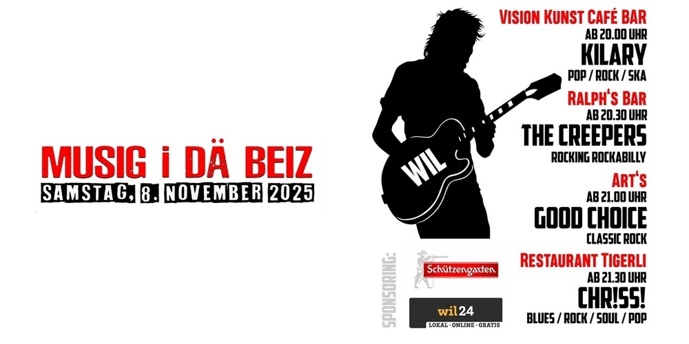 Den Auftakt macht um 20:00 Uhr im Vision Kunst Café Bar die Band KILARY mit Pop-, Rock- und Ska-Songs. Weiter geht’s um 20:30 Uhr in Ralph’s Bar, wo The Creepers mit Rockabilly-Rhythmen für Schwung sorgen. Im Art’s startet um 21:00 Uhr Good Choice mit kräftigem Classic Rock, bevor um 21:30 Uhr im Restaurant Tigerli CHR!SS! den Abend mit Blues-, Rock- und Soul-Klängen abrundet.