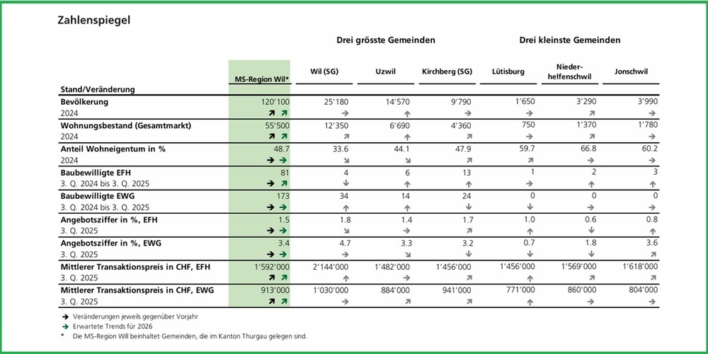 Die Region Wil steht bei Wohnungssuchenden weiterhin hoch im Kurs. Dazu trägt nicht nur die starke Vernetzung mit dem Metropolitanraum Zürich bei, sondern auch die attraktive Lage im Umfeld vielfältiger Naherholungsgebiete. Entsprechend überrascht es kaum, dass das Bevölkerungswachstum im vergangenen Jahr mit einem Plus von 1.0 Prozent erneut über dem kantonalen Mittel von 0.9 Prozent lag. Darüber hinaus hat der deutliche Rückgang der Hypothekarzinsen seit Mitte 2024 das Interesse an Wohneigentum belebt, auch wenn die Dynamik bereits wieder etwas nachgelassen hat.