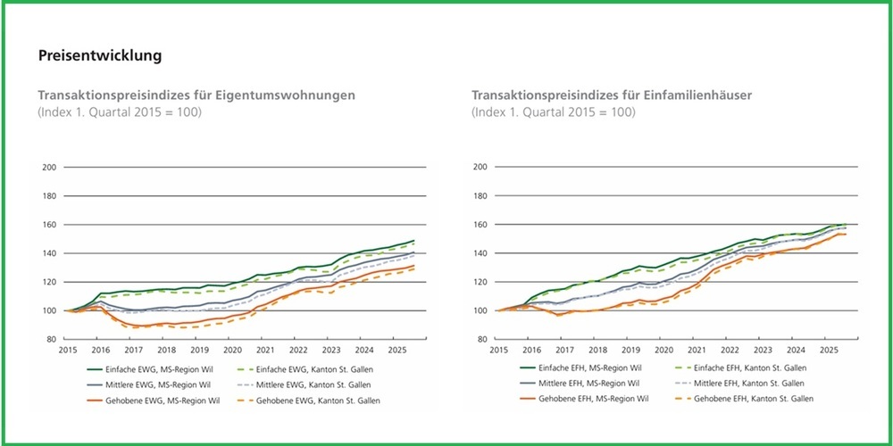 Die Preise für mittlere Eigentumswohnungen in der Region Wil legten im 3. Quartal 2025 innert Jahresfrist um 3.4 Prozent zu. In einzelnen Gemeinden fielen die Steigerungen jedoch deutlich kräftiger aus: Uzwil verzeichnete ein Plus von rund 5 Prozent, Oberbüren sogar von 8 Prozent. Im Segment der Einfamilienhäuser zeigte sich im regionalen Mittel eine noch dynamischere Entwicklung. Die Preise erhöhten sich im regionalen Durchschnitt um 4.4 Prozent, wobei insbesondere die Stadt Wil mit einem Anstieg von rund 9 Prozent hervorstach – ein Ausdruck des dort besonders ausgeprägten Nachfragedrucks.