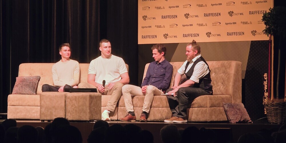 Benjamin Heutschi (ganz rechts) interviewte die Nominierten. Hier im Bild: v. l. Yannick Winkler, Damian Ott und Daniel Hubmann.