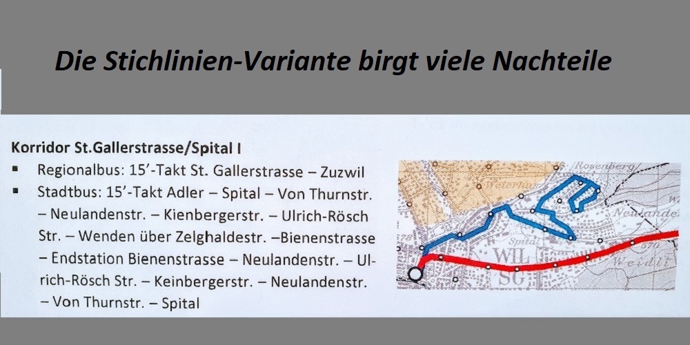 Das Buskonzept 2021 der Stadt Wil sieht verschiedene Änderungen bei den Stadtbusverbindungen vor. Das betrifft auch die Linie 701, die das Neulandenquartier bedient. Bedauerlicherweise bringt die geplante Umwandlung des heutigen Rundkurses in eine sogenannte Stichlinie hauptsächlich Verschlechterungen: Die zukünftige Linienführung erzeugt 20'000 Mehrkilometer pro Jahr mit entsprechenden grösseren Emissionen, denn alle 7 ½ Minuten, bzw. 115 mal täglich soll der Bus durch das Quartier fahren.