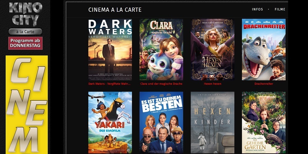 Pascal Nussbaum: „Auf unserer Webseite kino-city.ch unter à la Carte kann man aus über 30 Filmen auswählen und eine der freien Vorstellungszeiten buchen. Der Mindestbetrag von Fr.100.- wird als Anzahlung verrechnet. Diese Anzahlung wird dann an der Kinokasse beim Ticket- und Kioskumsatz angerechnet.“