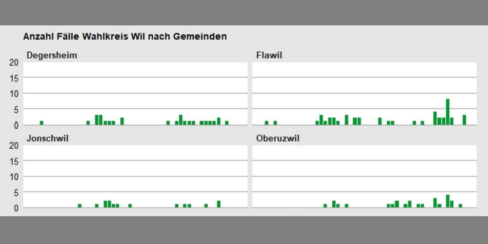 Sollte sich diese Entwicklung nicht verlangsamen, dann riskiert der Wahlkreis Wil vom Bundesamt für Gesundheit als Risikogebiet eingestuft zu werden. Die Situation in anderen Teilen des Kantons ist weit weniger kritisch. Die Zahl der bestätigten Fälle im gleichen Zeitraum beläuft sich beispielsweise im Wahlkreis St.Gallen auf 43 und im Werdenberg auf lediglich 8 Fälle.