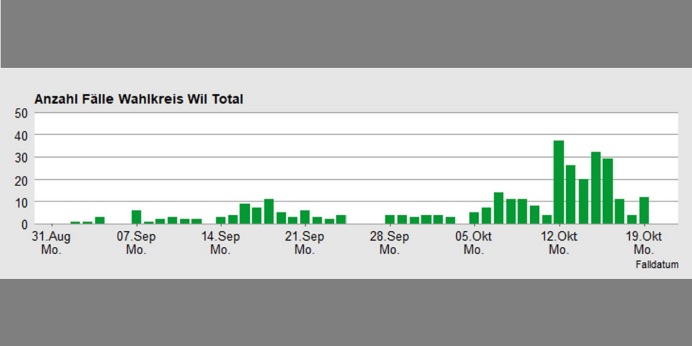 Wil ist aktuell der Coronahotspot des Kantons St.Gallen, nachdem in den letzten zwei Wochen im Wahlkreis rund 60 laborbestätigte Covid-19-Fälle pro 100’000 Einwohner registriert wurden. Während die Einwohnerzahl des Wahlkreis Wil 15 Prozent der Wohnbevölkerung des Kantons beträgt, entspricht die Anzahl der bestätigten Covid-19-Infektionen rund 25 Prozent aller Fälle im ganzen Kanton.