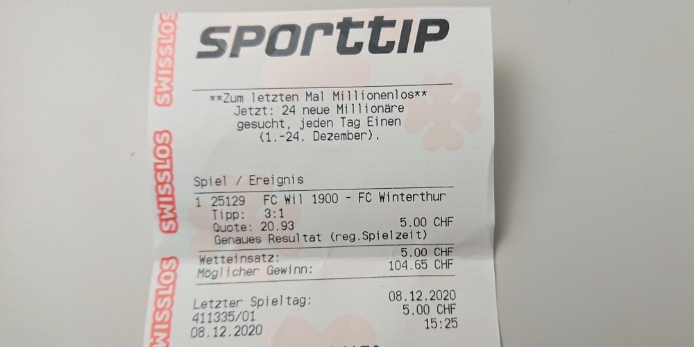 Heute wird es anders kommen: Jetzt beginnt die Serie der extrem starken Schlussviertelstunden des FC Wil! Ich wette darauf, dass der alte Bann gebrochen wird und habe 3:1 auf den FC Wil 1900 gewettet. Jetzt kann es nur gut kommen und ich erhalte für CHF 5.-- genau CHF 104.65 zurück. Hopp FC Wil!