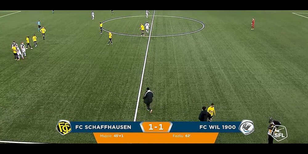 Nach etwas mehr als einer Stunde gelang Valon Fazliu der Ausgleich. Er wurde von Bledian Krasniqi mit einem sanften Heber in den Strafraum herrlich angespielt und versenkte die Kugel gekonnt in die Maschen der Schaffhauser. In der 82. Spielminute hatten die Wiler Glück, als Serkan Izmirlioglu einen Schuss von Francisco Rodriguez noch kurz vor der Torlinie abwehren konnte. (Bild: Screenshoot SFL NOW)