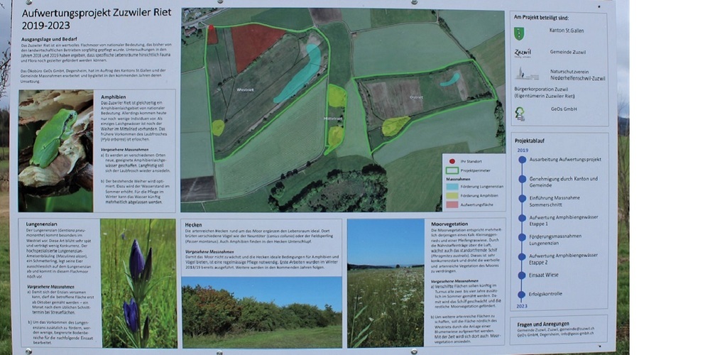 Der 1995 gegründete Naturschutzverein Niederhelfenschwil-Zuzwil beteiligt sich seit etlichen Jahren an den nachhaltigen Pflegemassnahmen im Zuzwiler Riet, das als ein national bedeutendes Flachmoor und Amphibienlaichgebiet gilt. Das aktuelle Aufwertungs- und Pflegeprojekt, welches von der Degersheimer Firma GeOs GmbH entwickelt wurde, erstreckt sich über einen Zeitraum von vier Jahren (2019 – 2023). Es umfasst drei Hauptziele: Die Erhaltung des Lungenenzians und des seltenen Lungenenzian-Ameisenbläulings, die Förderung der Amphibienvorkommen, speziell des Laubfroschs, und die Erhaltung der Moorvegetation. Die Kosten werden zu 90 Prozent vom Kanton und zu 10 Prozent von der Gemeinde Zuzwil getragen. Schon 2008 nahmen freiwillige Helferinnen und Helfer des Naturschutzvereins neue Heckenpflanzungen vor. Ein Jahr später machten sich rund 50 Naturschützer im Rietgelände auf die Suche nach dem Lungenenzian, der als Wirtspflanze des vom Aussterben bedrohten „Kleinen Moorbläulings“ gilt. Die entdeckten Standorte wurden mit GPS erfasst und kartographiert. In den folgenden Jahren wurde die Erfassung und Standortbestimmung wiederholt und aktualisiert.
