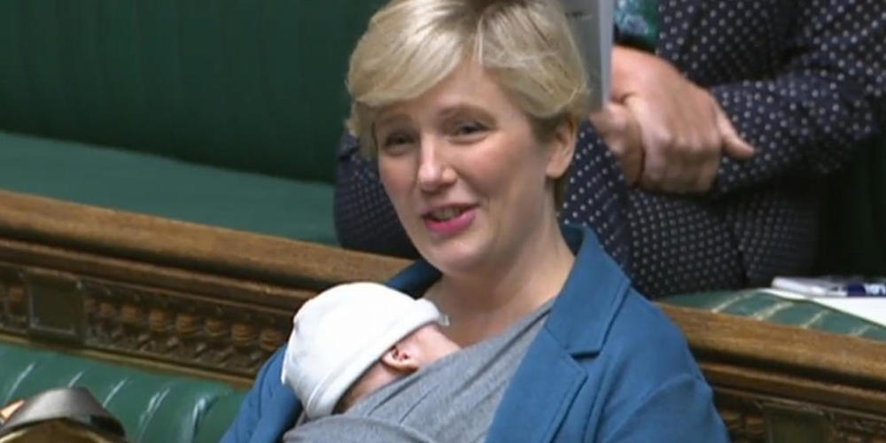 Die Labour-Politikerin Stella Creasy rief am Donnerstag den Tory-Politiker Jacob Rees-Mogg dazu auf, mehr Teilhabe für Abgeordnete mit kleinen Kindern zu ermöglichen. Rees-Mogg ist in der Regierung für die Koordination des Parlamentsbetriebs zuständig. Ihr Neugeborenes hatte sich Creasy bei ihrem Aufruf in einem Tuch um ihren Oberkörper geschnallt.