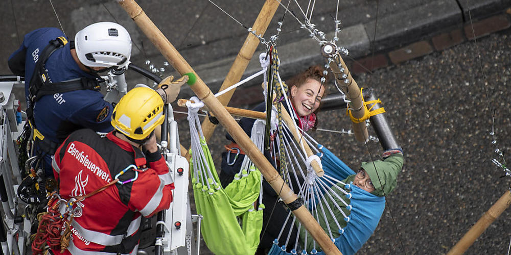Auf der Uraniastrasse hatten die Klima-Aktivisten kurz nach Mittag eine Holzkonstruktion aufgestellt. Zwei Demonstrantinnen ketteten sich in ein paar Metern Höhe an dieses Gerüst. Sie mussten von spezialisierten Höhenrettern von Schutz & Rettung Zürich vorsichtig heruntergeholt werden, was bis halb drei Uhr dauerte.