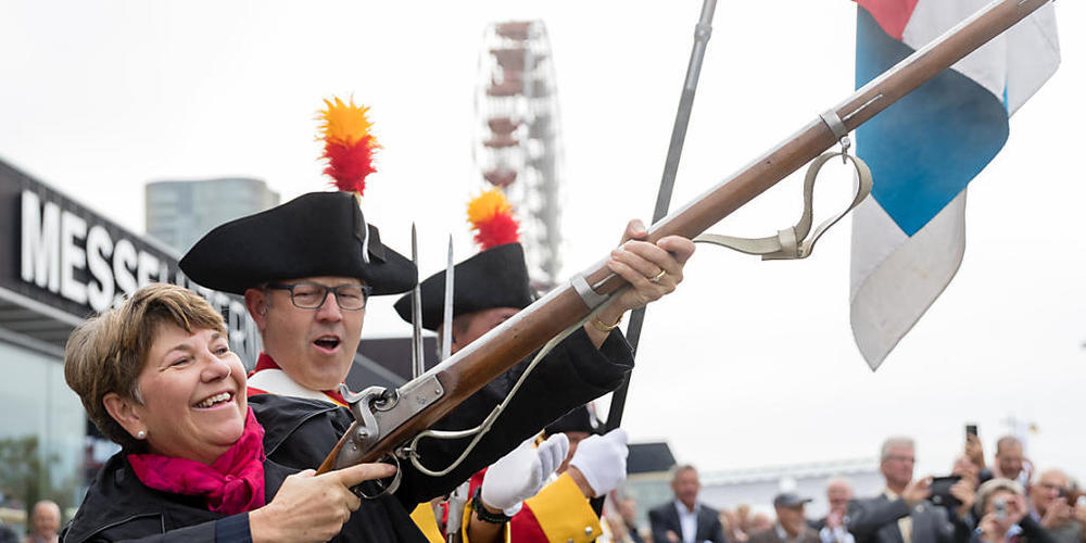 Auch Viola Amherd, Vorsteherin des Eidgenössischen Departements für Verteidigung, Bevölkerungsschutz und Sport (VBS), marschierte mit. Die Magistratin liess es sich nicht nehmen, nach dem Einzug mit den Grenadieren der Zunft zu Safran eigenhändig einen Schuss abzufeuern.