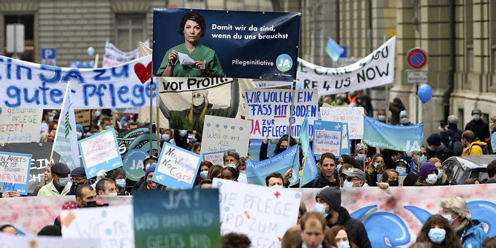 Mehrere tausend Personen zogen am Nachmittag von der Schützenmatte durch die Stadt zu einer Schlusskundgebung auf dem Bundesplatz. Sie skandierten Slogans wie "Notruf - Pflegeberuf". Die Organisatorinnen des Bündnis' Gesundheitspersonal schätzten die Zahl auf 5000 Teilnehmende.